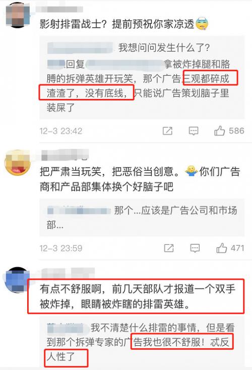 在人们向英雄表达敬意之时,凯迪仕的广告《拆弹专家》却点燃了网友的怒火。随后,人民日报微博、共青团中央微博纷纷发声,指出该广告涉嫌侮辱排雷战士。网友们也纷纷表示,“广告可以有创意,但不能没有底线”。