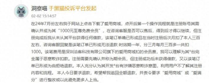 在该投诉中,网友还直指“该笔费用是深圳洽客科技有限公司旗下的爱用商城扣的会员费,我可以理解为其平台完全属于恶意欺诈扣款。注册需要先确认并称为期会员,但注册成功后未获得借款,又以该笔订单已形成为由拒绝退款。本人充分认为其开发平台有涉嫌恶意欺诈意图,利用用户不了解其注册内容和流程。本人今日要求退款,希望帮我追回全额退款,并责令要求‘爱用商城’或‘爱满分’进行整改或以此避免更多人上当。”