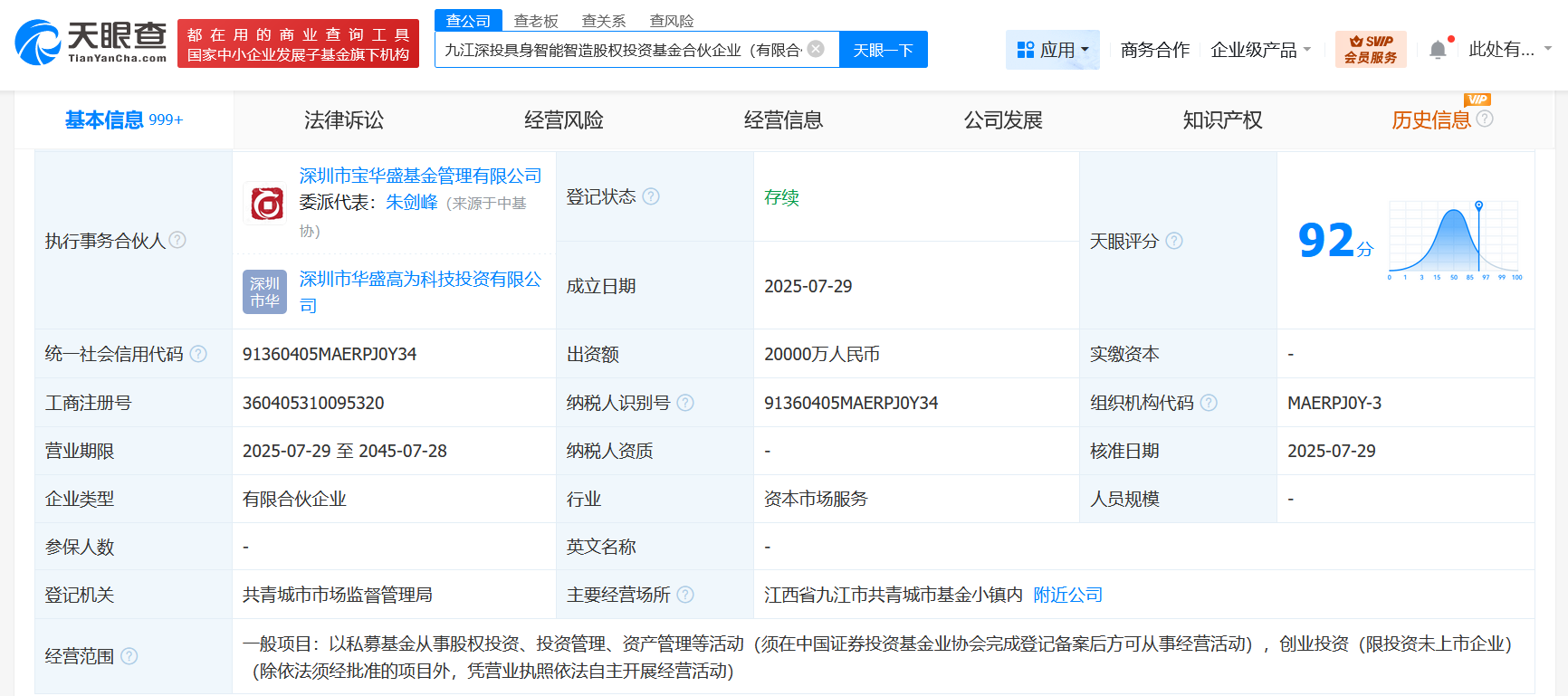 天眼查工商信息显示,近日,九江深投具身智能智造股权投资基金合伙企业(有限合伙)成立,执行事务合伙人为深圳市宝华盛基金管理有限公司、深圳市华盛高为科技投资有限公司,出资额2亿人民币,经营范围为以私募基金从事股权投资、投资管理、资产管理等活动,创业投资。