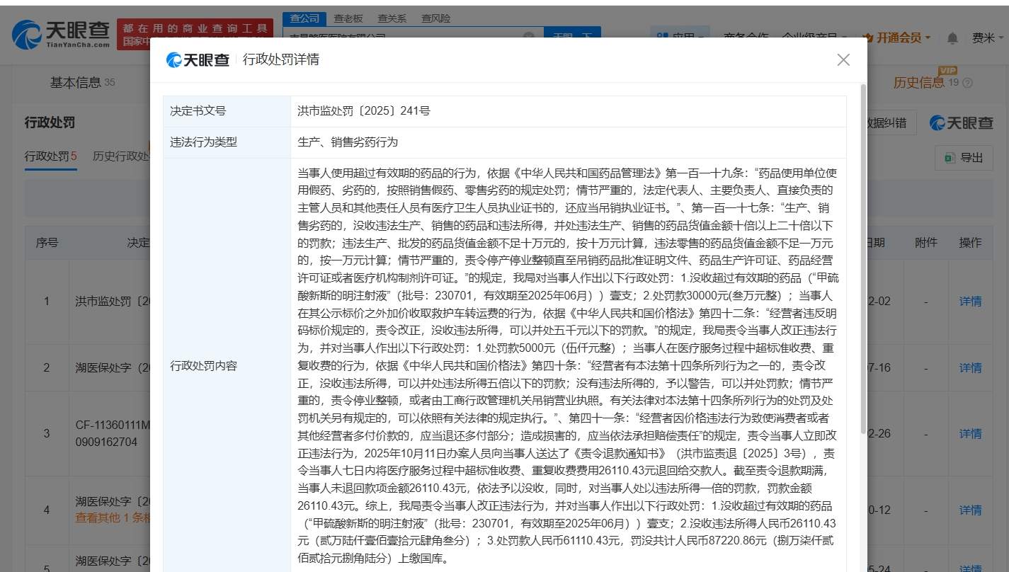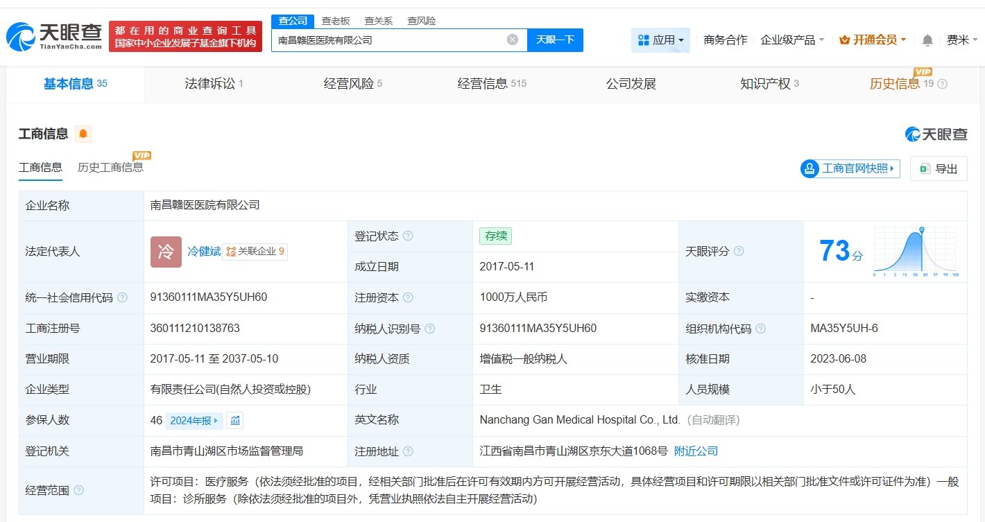 天眼查经营风险信息显示,近日,南昌赣医医院有限公司因生产、销售劣药行为,被南昌市市场监督管理局罚款6.1万余元,没收2.6万余元。