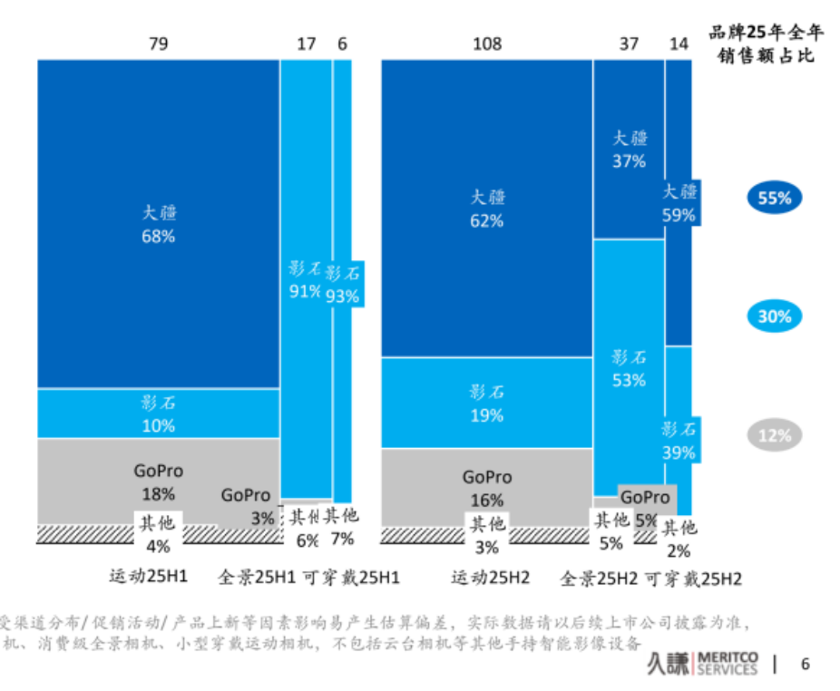 根据报告透露的数据显示,2025年上半年全景相机市场影石占据着91%份额,而下半年就缩水到53%,虽仍旧占据市场第一宝座,可市场统治力方面完全不可同日而语。报告中虽未直接列出这一变化原因,可从细节中能够窥探一二。