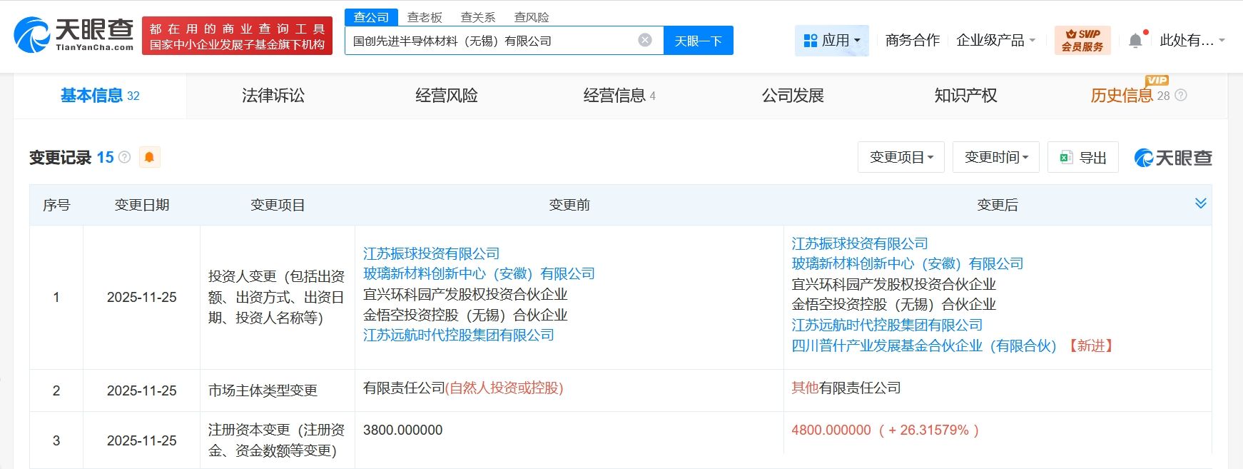 天眼查App显示,近日,国创先进半导体材料(无锡)有限公司发生工商变更,新增五粮液旗下四川普什产业发展基金合伙企业(有限合伙)为股东,注册资本由3800万人民币增至4800万人民币。
