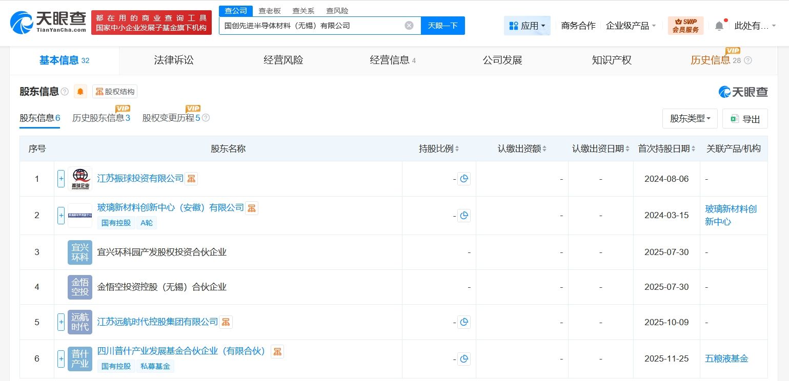 国创先进半导体材料(无锡)有限公司成立于2024年3月,法定代表人为郑际杰,经营范围含工程和技术研究和试验发展、技术玻璃制品制造、技术玻璃制品销售、新材料技术推广服务、新材料技术研发、技术进出口等。股东信息显示,该公司现由江苏远航时代控股集团有限公司、玻璃新材料创新中心(安徽)有限公司、江苏振球投资有限公司及上述新增股东等共同持股。