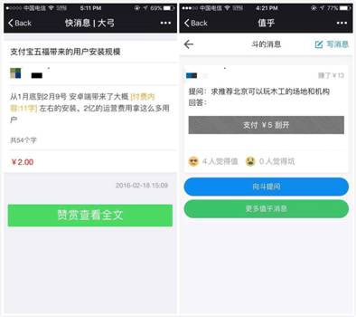 此外,今年2月份,土豆网的元老级人物Aether Wu曾经在一个叫做大弓的公众账号上做过一个“快消息”的产品,是通过隐藏一部分文字信息然后对剩余部分付费才可见。值乎的第一个版本也有这个功能,而且几乎一样。随后大弓在4月份出了新功能的“大弓有答”,与值乎刮刮卡模式不同的是,这是付费请人回答问题的模式。后来,在值乎5月13号的版本也见到了这个功能。一时间,两张“大弓竟被知乎抄了”、“大弓又被知乎抄了”的图在圈内流传甚广。虽然“模仿”或者克隆在新创业的项目中也常见,不过对于后进入者还是应该避免这种质疑。