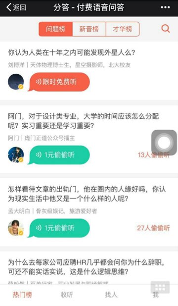 这也从一个侧面说明分答的团队在产品的迭代方面确实是下功夫了。这或许也是为何王思聪、鹦鹉史航、周国平、窦文涛、冯仑、章子怡、海清、刘建宏等各大领域的大咖要入驻这个平台的原因之一吧?