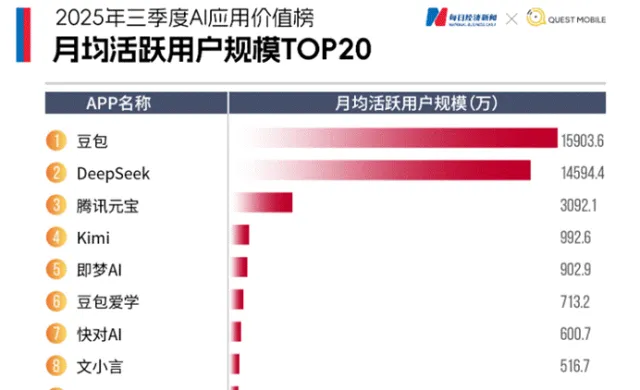QuestMobile《2025年三季度AI应用价值榜》显示,字节跳动旗下豆包月活已达1.59亿,下载量3447万;百度文小言月活仅为516.7万。而阿里千问在短短23天内月活跃用户突破3000万,成为全球增长最快的AI应用之一。