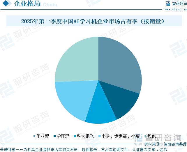 据智研咨询调研数据显示,2025年第一季度,作业帮、学而思、科大讯飞、步步高、小猿和小度六大品牌合计占据74.4%的市场份额,而前六大品牌之间并没有拉开绝对的身位差距。
