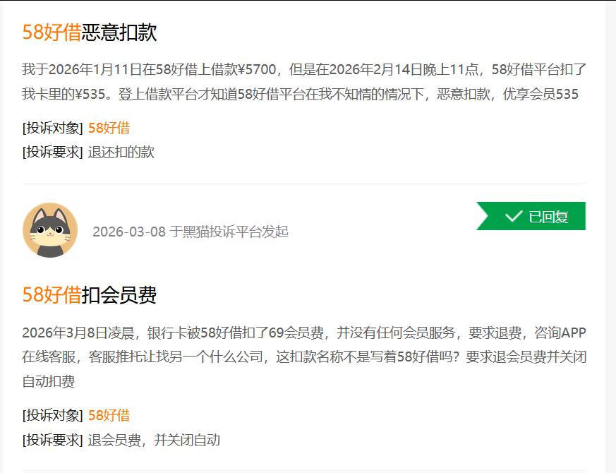 有网友投诉:“我于2026年1月11日在58好借上借款5700元,但是在2026年2月14日晚上11点,58好借平台扣了我卡里的535元。登上借款平台才知道58好借平台在我不知情的情况下,恶意扣款优享会员费535元。”