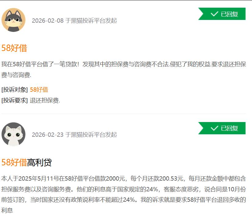 有网友投诉:“本人是58好借平台借款用户,借款共5次分6期还款,现已正常还款结清。 经核查,本人发现该笔借款存在严重的收费乱象: 1.在58好借APP内,每期还款被拆分为本金+利息+咨询服务费+担保服务费该服务费由第三方收取,平台未履行告知义务。其次每笔借款前已经支付平台推出的会员优惠服务费用,这里属于多次违规违法乱收费现象。”