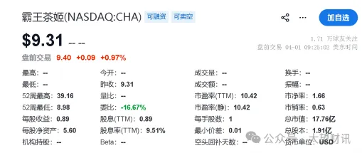 随着2025年经营数据全面走弱,霸王茶姬股价呈现回落态势,截至2026年3月31日,股价约为9.31美元/股,相较于上市后最高股价39.16美元/股,下跌约76.2%;市值降至约17.76亿美元,较刚登陆纳斯达克后约76.7亿美元的市值峰值蒸发近59亿美元,折合人民币约428亿元。