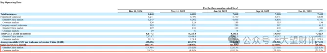 除此之外,霸王茶姬门店运营与资金使用层面同样暗藏隐忧。尽管全球门店数量增至7453家,同比增长约15.7%,但单店产出接连走低,大中华区同店GMV连续四个季度负增长,2025年四季度同比下滑25.5%;截至2025年末,单店月均GMV降至约33.74万元,同比降幅达26%,依靠门店数量拉动增长的粗放模式已难以为继。