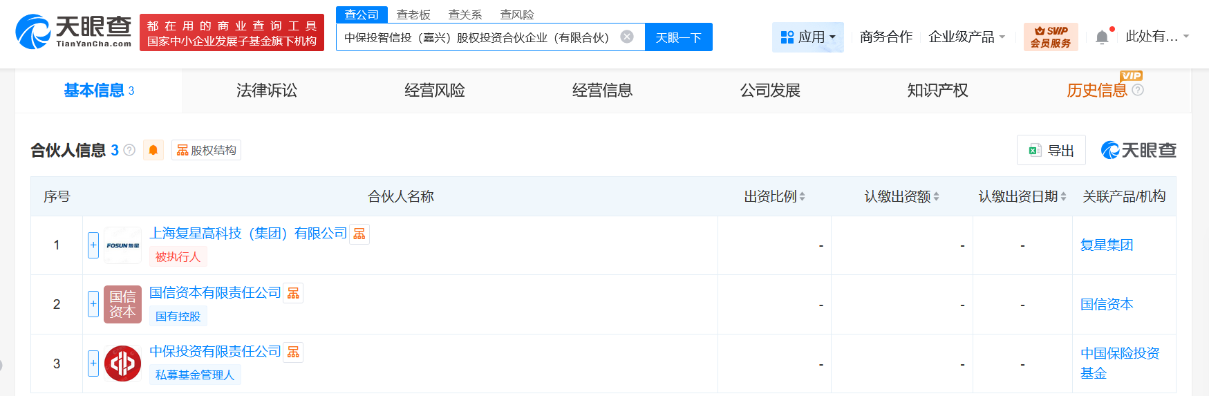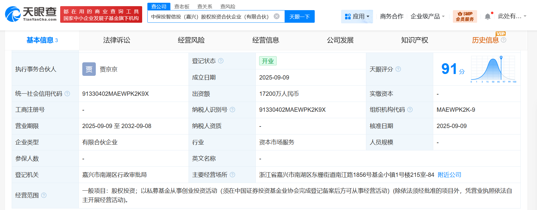 天眼查工商信息显示,近日,中保投智信投(嘉兴)股权投资合伙企业(有限合伙)成立,执行事务合伙人为贾京京,出资额1.72亿人民币,经营范围为股权投资、以私募基金从事创业投资活动。合伙人信息显示,该企业由复星国际(00656.HK)旗下上海复星高科技(集团)有限公司、国信资本有限责任公司、中保投资有限责任公司共同出资。