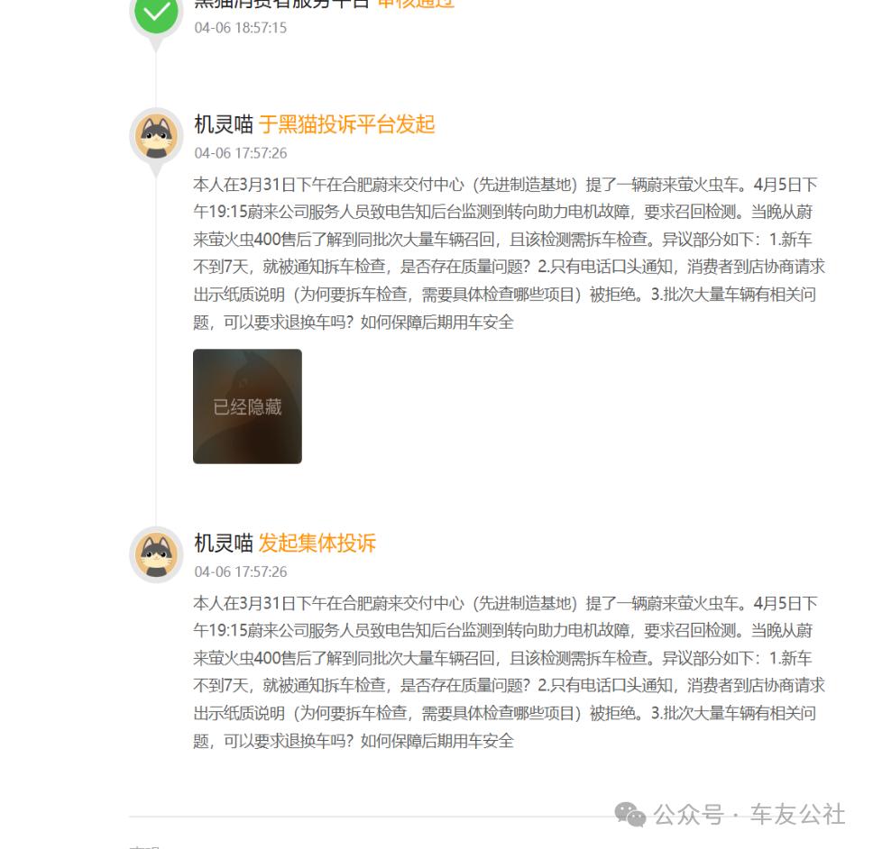 第三方投诉平台同样出现大量同类投诉。黑猫投诉平台上,有车主反馈了和徐女士同样的“时间线”:其3月31日下午在合肥蔚来交付中心提车,4月5日晚就接到蔚来工作人员电话,告知后台监测到转向助力电机故障,要求回店检测。该车主同样提出多项质疑:新车不到7天就要拆车检查,是否存在出厂质量缺陷;仅收到电话口头通知,到店后要求出示纸质检测说明与项目清单被拒绝;同批次大量车辆出现问题,能否要求退换车,后续用车安全如何保障。