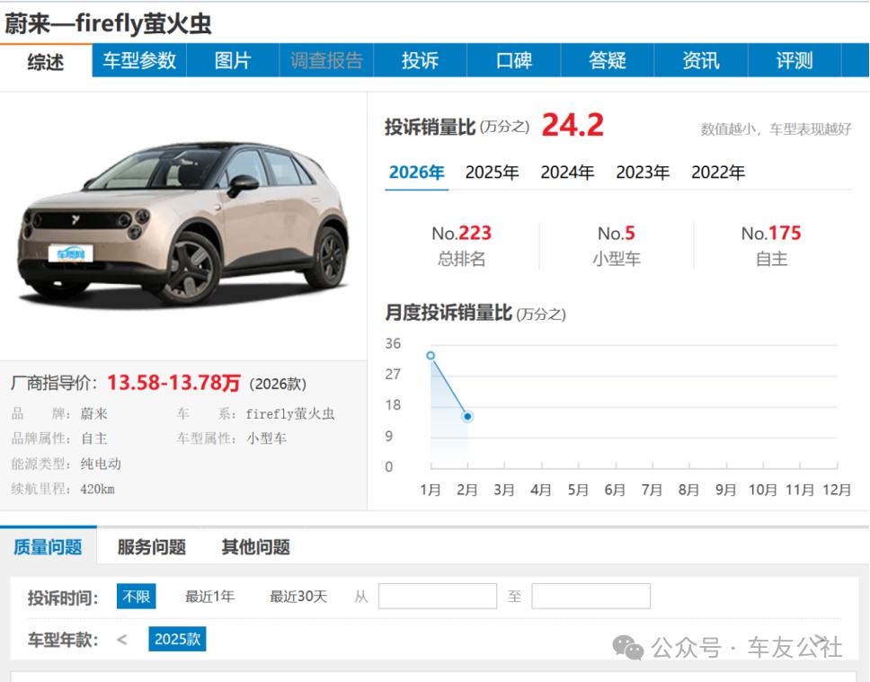 车友公社从车质网查询到的公开数据显示,蔚来萤火虫品牌旗下2025款车型,2025年全年投诉销量比为万分之12.9,2026年1-2月该数值升至万分之24.2,投诉量出现明显上升。除此次集中爆发的转向系统相关故障外,投诉问题还集中在空调问题、车身及部件生锈等方面。