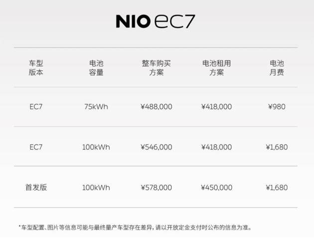 EC7搭载75kWh电池包车型起售价488,000元;搭载100kWh电池包车型起售价546,000元;BaaS方案起售价418,000元。即日起于蔚来APP开放预订,预计2023年5月开启交付。