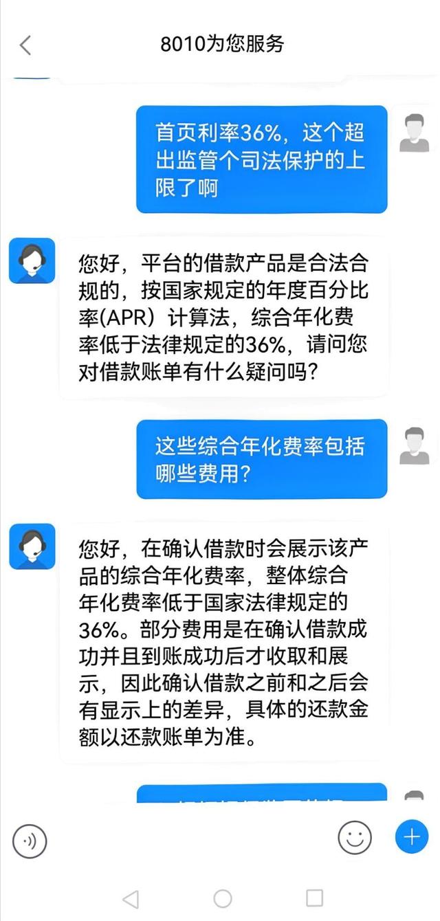对于36%的利率,客服称:“平台借款产品是合法合规,综合年化费率低于法律规定的36%”。