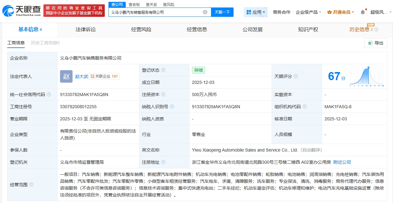 天眼查App显示,近日,义乌小鹏汽车销售服务有限公司成立,法定代表人为赵大武,注册资本500万人民币,经营范围包括汽车销售、新能源汽车整车销售、新能源汽车电附件销售、机动车充电销售等。