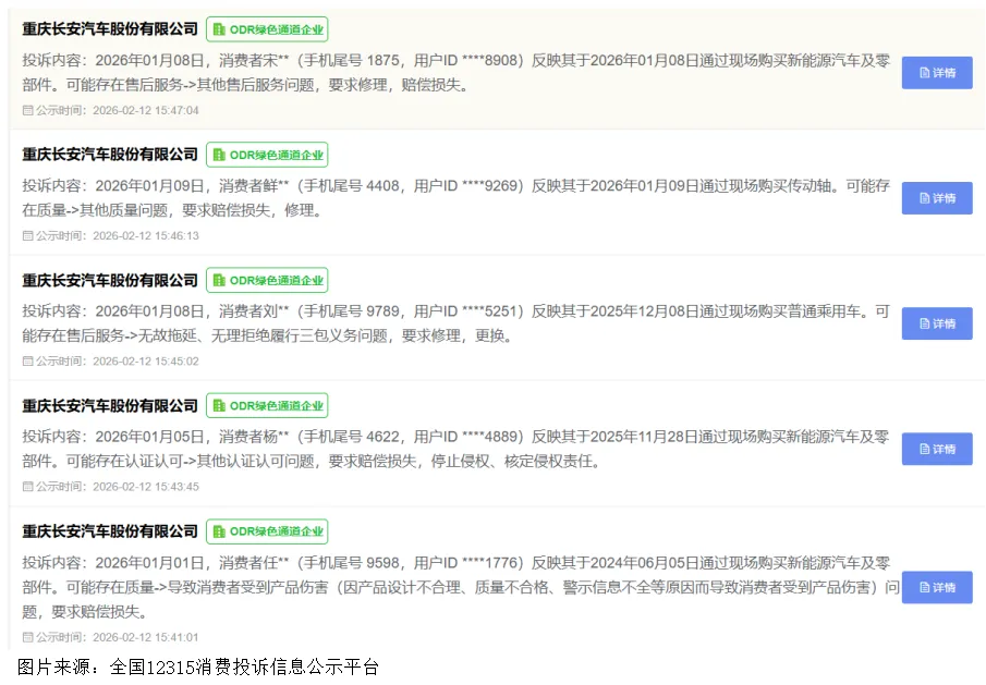 根据12315平台公示信息,2026年1月以来,多名消费者投诉长安汽车存在产品掺杂掺假、以假充真、以次充好的问题,另有投诉涉及无故拖延、无理拒绝履行三包义务及虚假宣传。