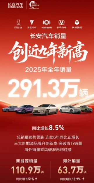 根据公司公布的12月产销快报显示,2025年长安汽车全年营收约为2860亿元,销量更是达到了291.3万辆的惊人数字,同比增长8.54%,创下了近九年来的历史新高。