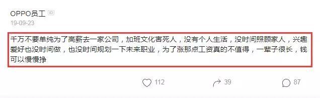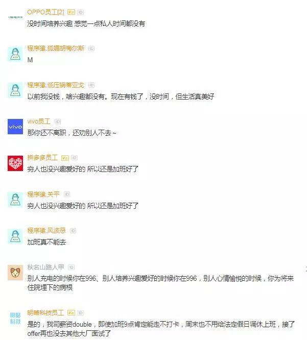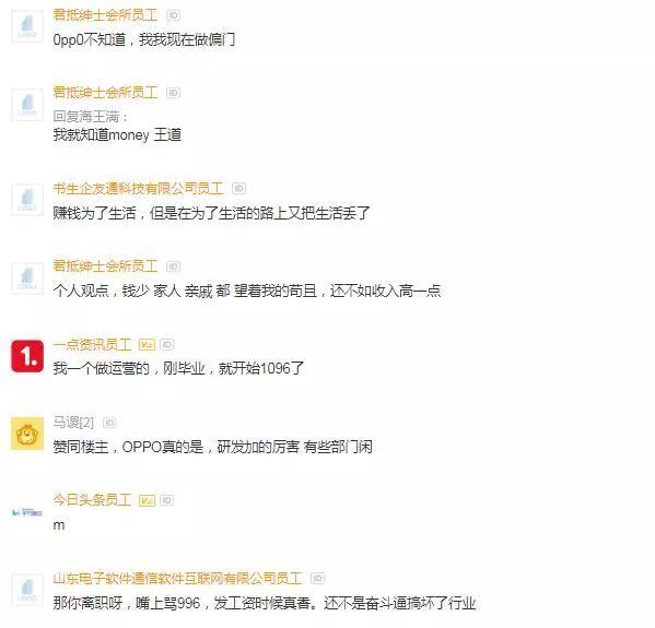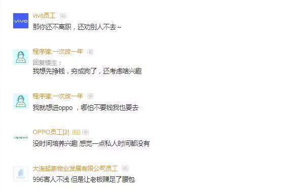 也有网友表示了羡慕。我就想进oppo ,哪怕不要钱我也要去,忘了说了,我的兴趣爱好就是加班。我想先挣钱,穷成狗了,还考虑啥兴趣,那你还不离职,还劝别人不去~穷人也没兴趣爱好的,所以还是加班好了。没钱更痛苦。