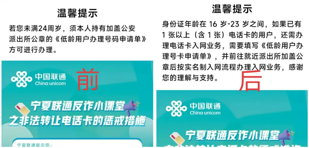 宁夏联通客服表示,宁夏地区16-23周岁的用户属于低龄群体,大部分是以学生为主的,社会经验,还有法律意识不足,容易被一些兼职高薪、刷单返利的幌子诱导,出租、出借自己的电话卡给这些团伙。所以就采取了一个相关的措施,从源头上斩断这种诈骗。