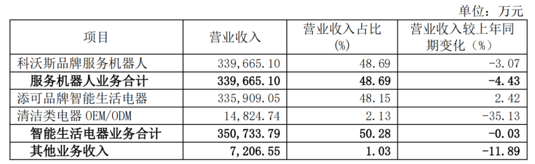 根据财报,按照业务构成划分,科沃斯拥有服务机器人业务、智能生活电器业务、其他业务三大业务板块,而服务机器人业务细分下的科沃斯品牌服务机器人收入为33.97 亿元,同比下降3.07%,拖累服务机器人业务同比下降4.43%。此外,智能生活电器业务收入和其他业务收入也分别同比下降0.03%和11.89%。