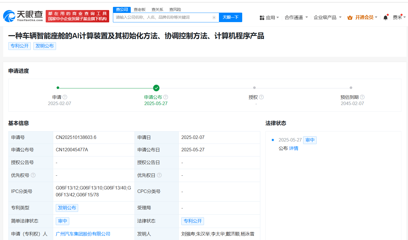天眼查财产线索信息显示,近日,广汽集团(601238)申请的“一种车辆智能座舱的AI计算装置及其初始化方法、协调控制方法、计算机程序产品”专利公布。