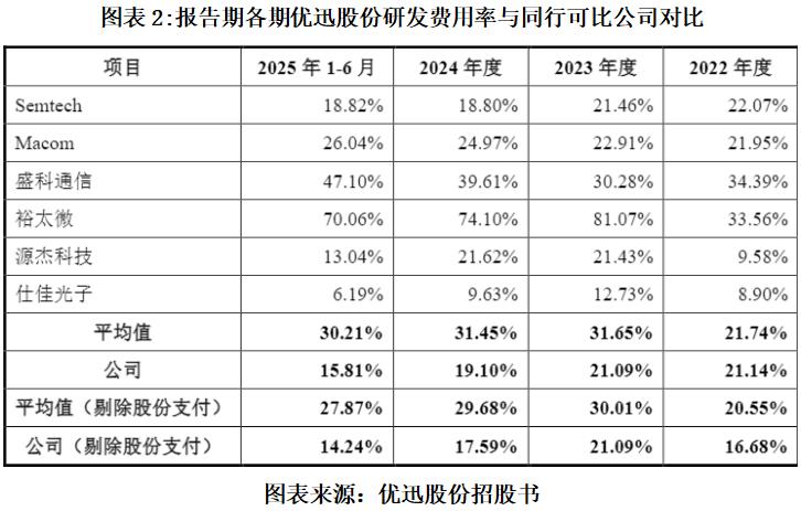 招股书显示,报告期各期,优迅股份的研发费用率(剔除股份支付)分别为16.68%、21.09%、17.59%、14.24%,而同期境内外同行可比公司研发费用率均值(剔除股份支付)分别为20.55%、30.01%、29.68%、27.87%,远高于优迅股份。从单个企业来看,Macom(MTSI.O)、裕太微(688515.SH)和盛科通信(688702.SH)的研发费用率持续高于优迅股份。