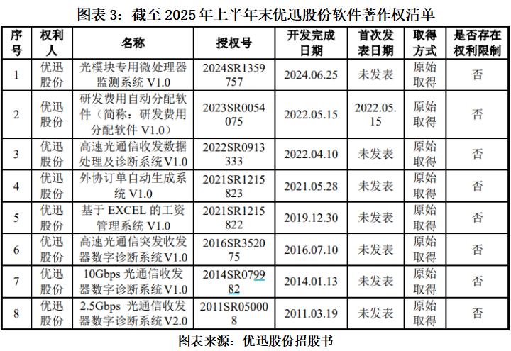 需注意的是,截至2025年6月30日,优迅股份仅拥有8项软件著作权,且其中有3项可能属于公司内部行政管理系统,软件著作权的含金量和软件收入真实性值得关注。