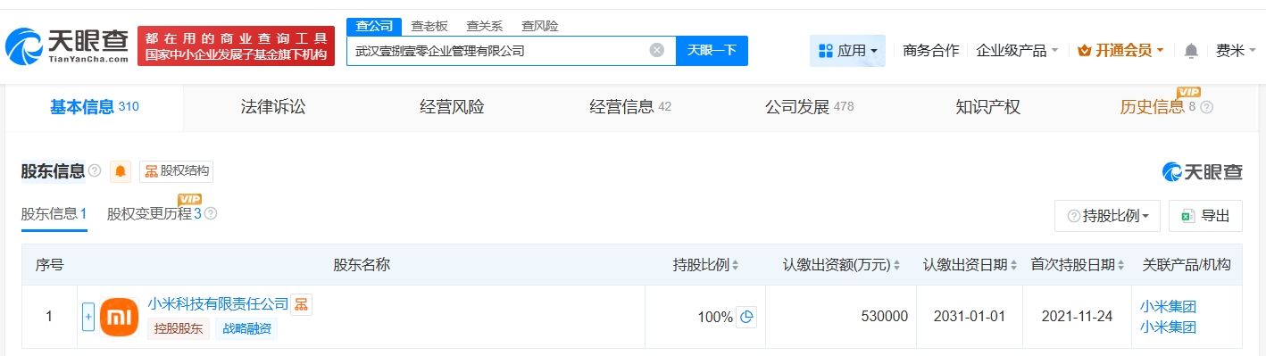 武汉壹捌壹零企业管理有限公司成立于2021年11月,法定代表人为林世伟,经营范围为企业管理、企业管理咨询、信息咨询服务。股东信息显示,该公司由小米科技有限责任公司全资持股。