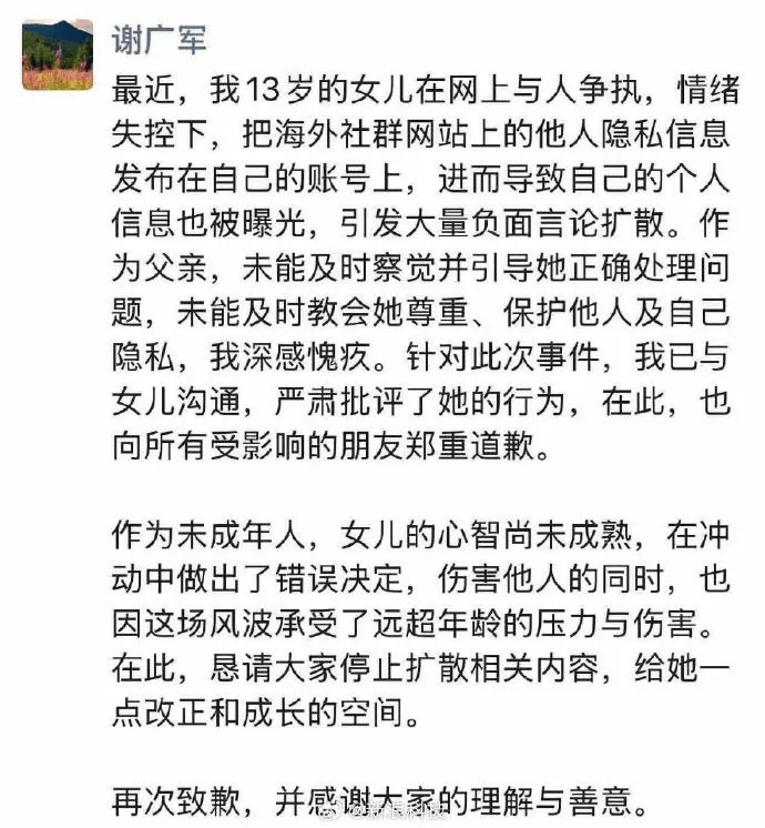 今年3月,“月入22万”的百度副总裁谢广军因女儿“开盒”孕妇事件致歉,一度登上热搜榜首。其女儿涉嫌曝光他人隐私信息,引发轩然大波。