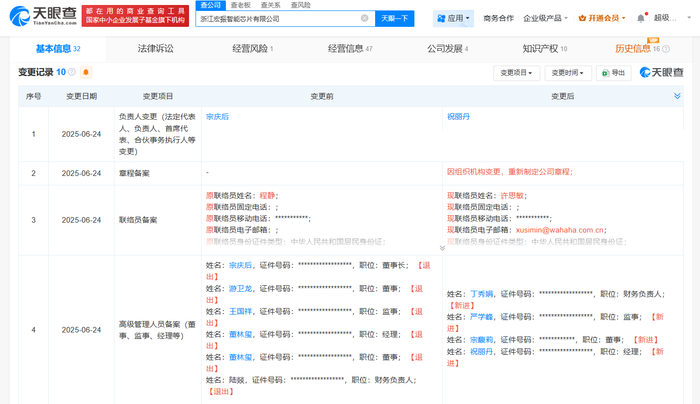 浙江宏振智能芯片有限公司成立于2019年11月,法定代表人为祝丽丹,注册资本1000万人民币,经营范围包括集成电路、电路模块、软件程序、频率控制器及发生器的技术开发等,由浙江德清娃哈哈科技创新中心有限公司、董林玺共同持股。变更记录显示,今年6月,宗庆后卸任该公司董事长,新增宗馥莉任董事。