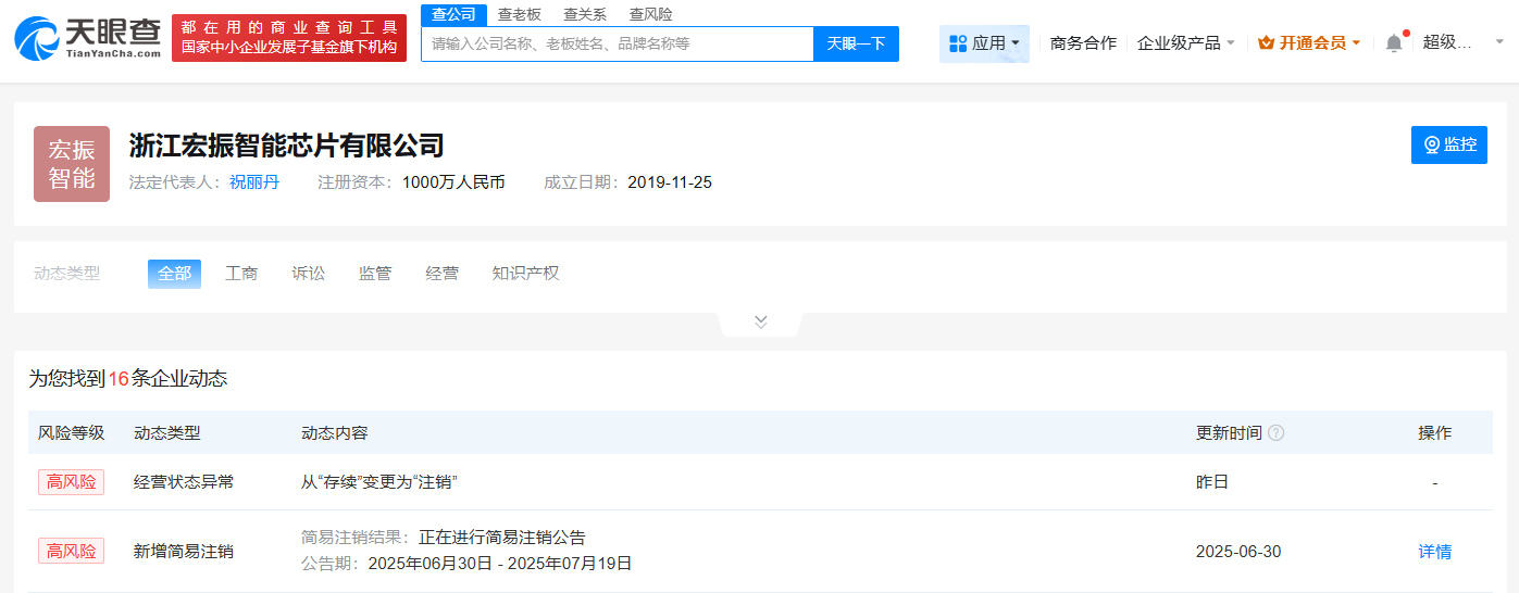 天眼查App显示,近日,浙江宏振智能芯片有限公司登记状态由存续变更为注销。此前,该公司已发布简易注销公告。