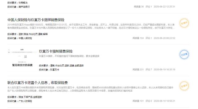 针对此问题也有众多用户反馈,聚投诉上有网友称“玖富万卡与中国人民保险私自捆绑签订了一份个人贷款保证保险,对此我本人一律不知情,在近日才得知有这么一份保险存在”、“玖富万卡借款,不知情的情况下强制搭售保险,要求全额退保”……目前,玖富万卡在黑猫平台的投诉量已达到3万多条。强搭保险已使民众怨声载道,而今内部又出现矛盾,这也直接影响到玖富数科的收入。