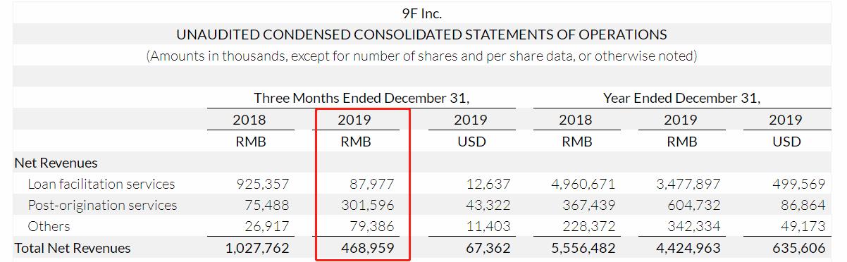 最新财报显示,2019年第四季度总收入为4.690亿元,相比去年同期的10.278亿元,降幅达54.4%,主要原因是促成贷款服务收入减少。
