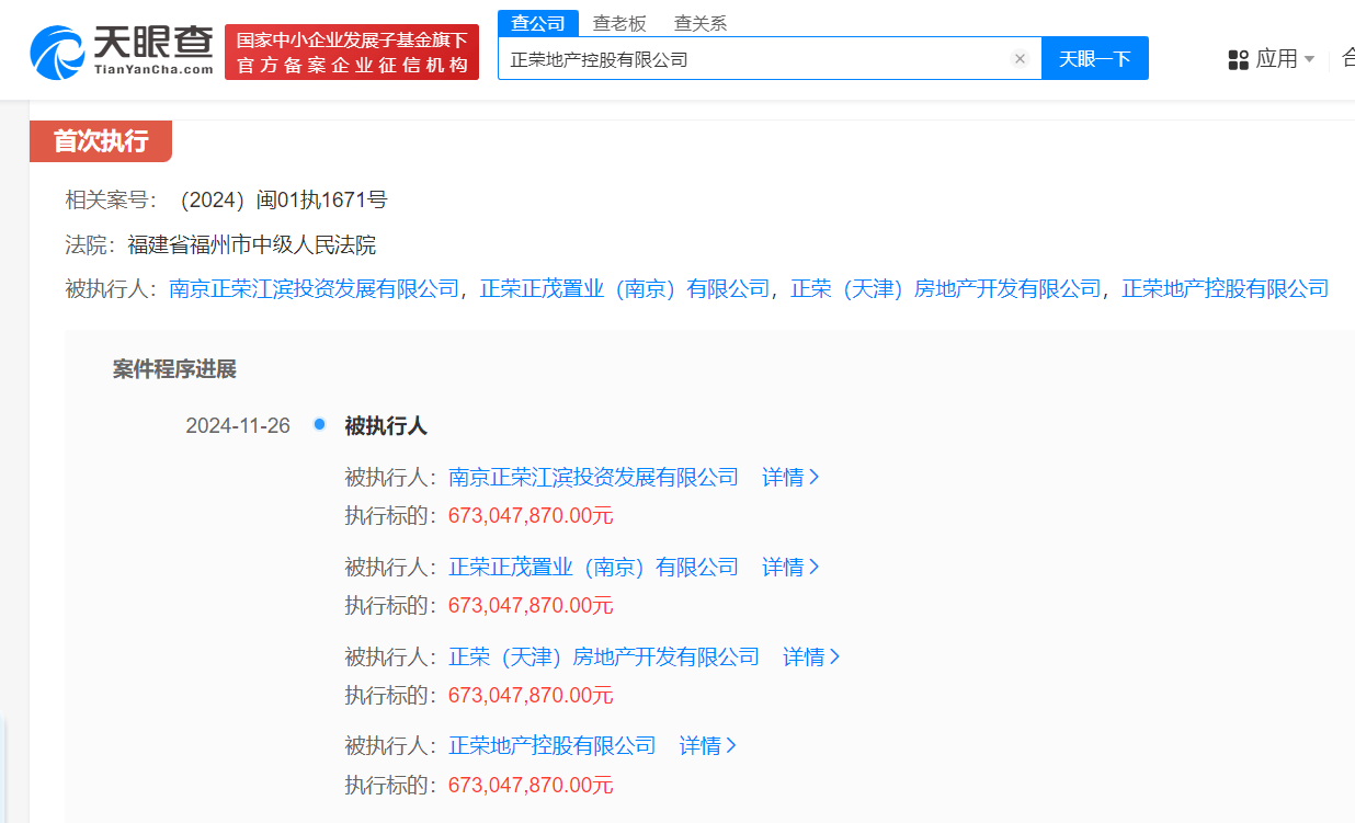 近日,正荣地产控股有限公司及旗下南京正荣江滨投资发展有限公司、正荣正茂置业(南京)有限公司、正荣(天津)房地产开发有限公司新增一则被执行人信息,执行标的6.73亿余元,执行法院为福建省福州市中级人民法院。