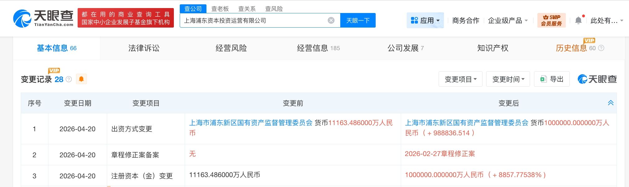 天眼查App显示,近日,上海浦东资本投资运营有限公司发生工商变更,注册资本由约1.1亿人民币增至100亿人民币,增幅约8858%。