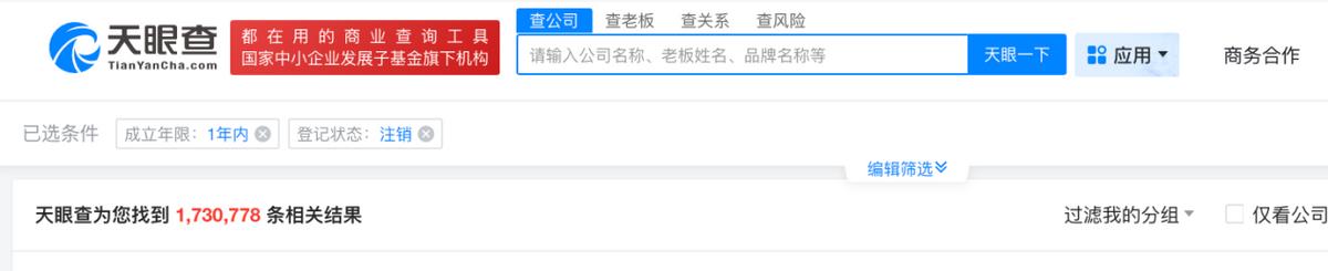 今天我们所处的时代,是一个供给过剩的时代,竞争极为惨烈。来自天眼查APP搜索数据显示,成立年限为一年内,登记状态为注销的企业数量就有173万家。