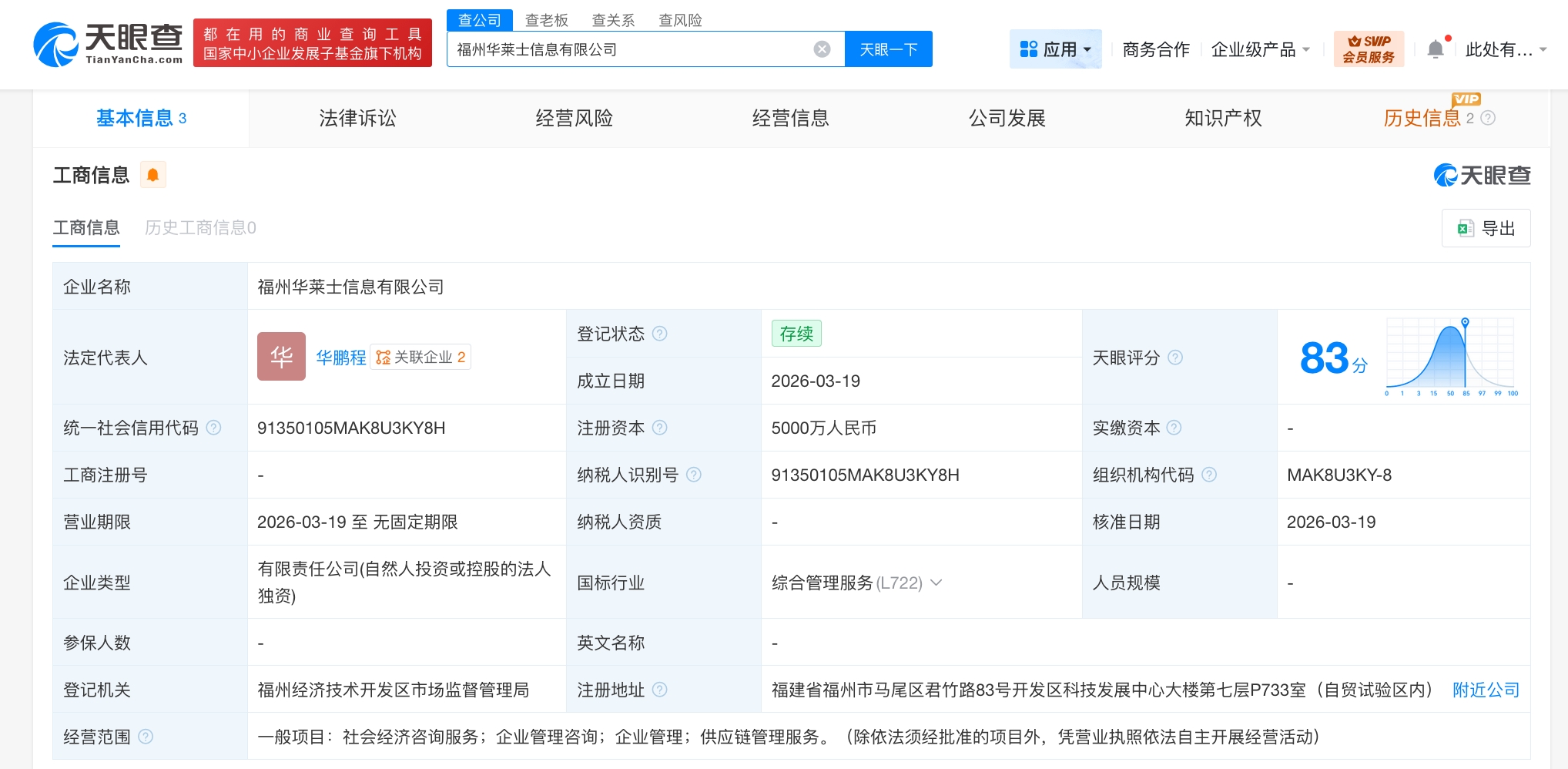 天眼查工商信息显示,近日,福州华莱士信息有限公司成立,法定代表人为华鹏程,注册资本5000万人民币,经营范围为社会经济咨询服务、企业管理咨询、企业管理、供应链管理服务。