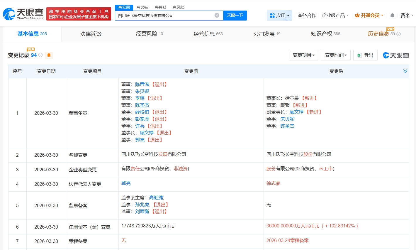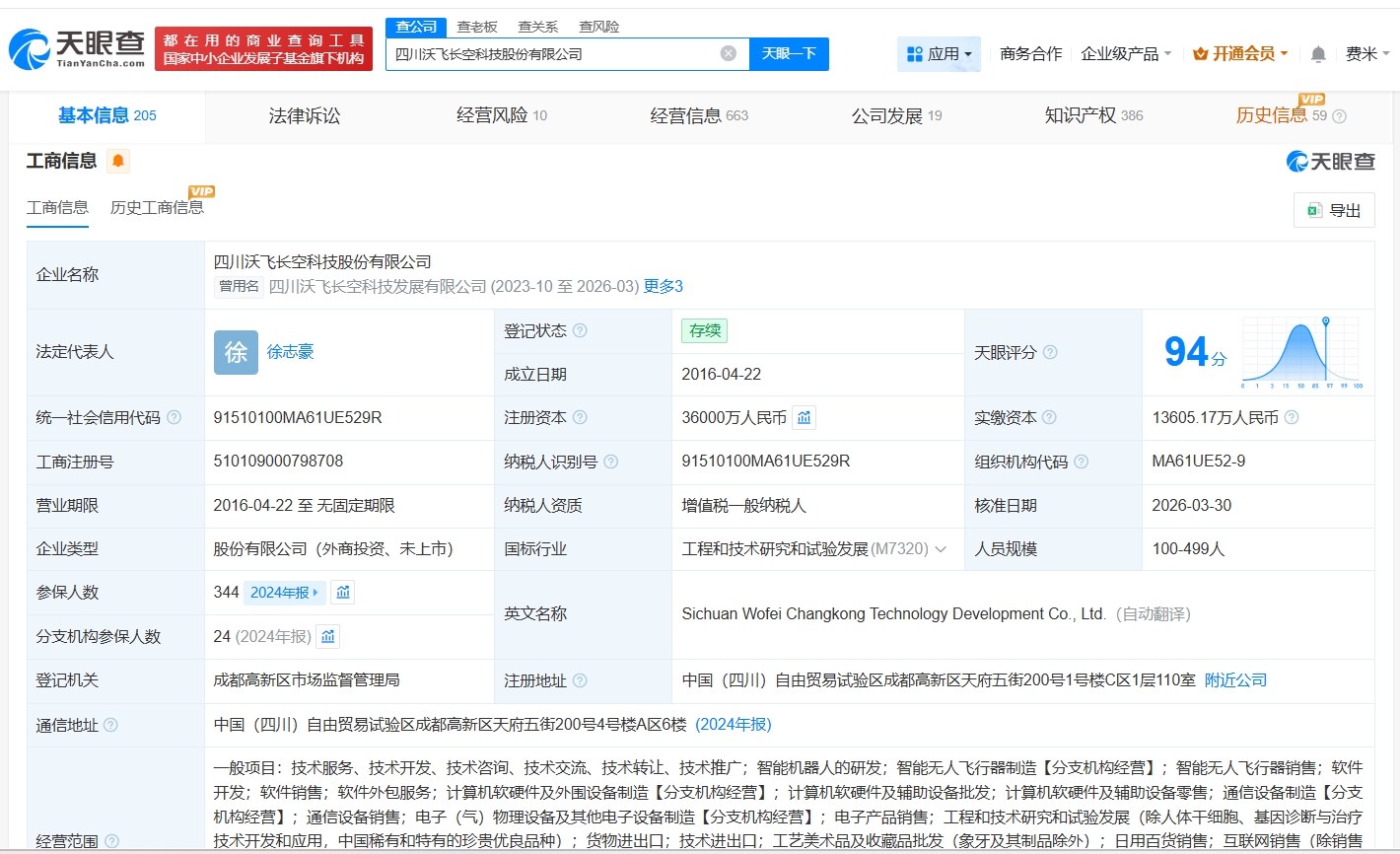 天眼查App显示,近日,四川沃飞长空科技发展有限公司发生工商变更,企业名称变更为四川沃飞长空科技股份有限公司,郭亮卸任法定代表人,顾文婷卸任董事长,徐志豪接任法定代表人、董事长,同时,注册资本由约1.77亿人民币增至3.6亿人民币,增幅约103%。