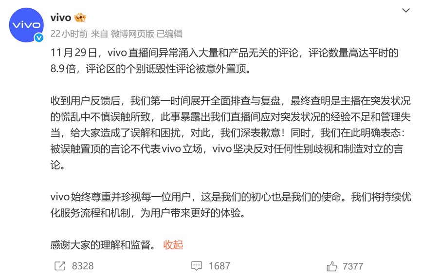 近日,vivo陷入了一场突如其来的舆论风波。有网友爆料称,vivo直播间内出现了“不需要女用户哦,购买力太差”等不当言论,并被意外置顶,瞬间引发了广泛的社会关注和舆论谴责。尽管vivo官方迅速回应,称这是主播在突发状况下的误触操作,并表达了歉意,但此次事件无疑对vivo的品牌形象造成了严重的负面影响。