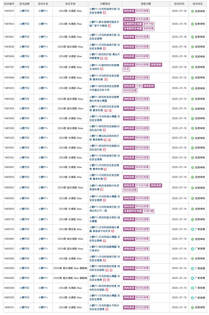 观察者网注意到,在专注于汽车质量投诉与缺陷信息的第三方平台“车质网”上,目前已有大量关于“小鹏P7+方向机”“小鹏P7+转向机”的投诉。