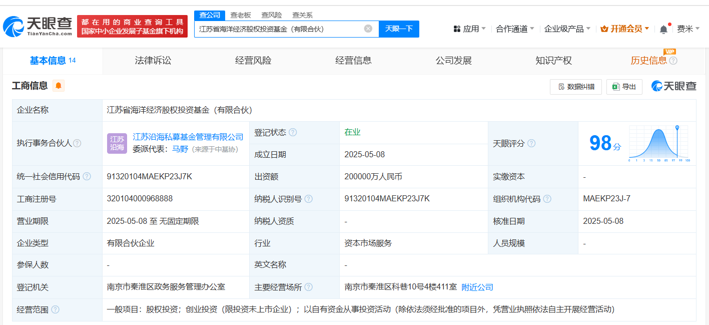 天眼查App显示,近日,江苏省海洋经济股权投资基金(有限合伙)成立,执行事务合伙人为江苏沿海私募基金管理有限公司,出资额20亿人民币,经营范围为股权投资、创业投资、以自有资金从事投资活动,由江苏省战略性新兴产业母基金有限公司、江苏省沿海开发投资有限公司、江苏黄海金融控股集团有限公司等共同出资。