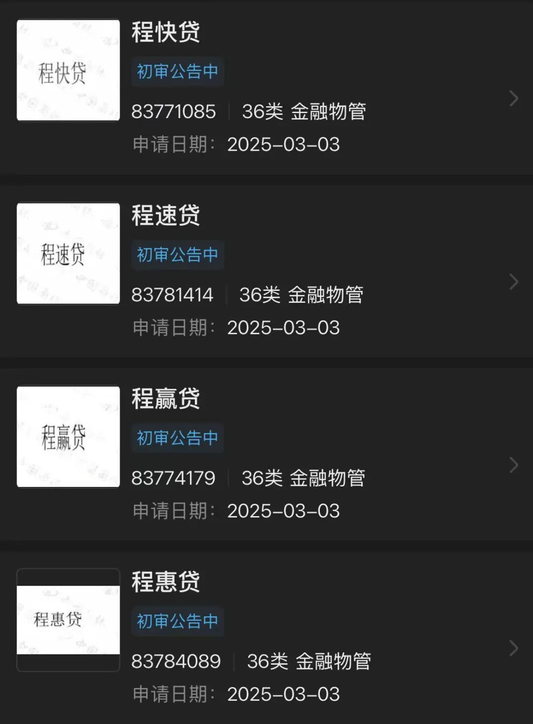 今年年初,携程小贷申请注册了程惠贷、程速贷、程赢贷、程快贷等贷款类商标。不知后续携程金融还会有什么动作。