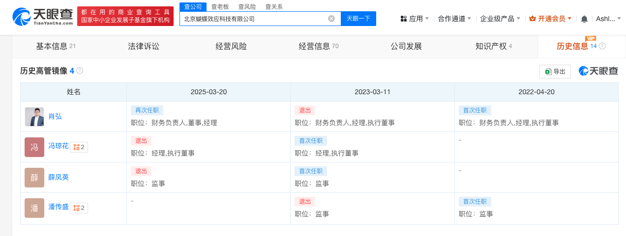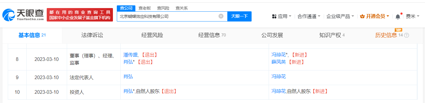 天眼查App显示,近日,北京蝴蝶效应科技有限公司发生工商变更,原股东薛凤英退出,新增Manus创始人肖弘等为股东,冯琼花卸任法定代表人、执行董事、经理,由肖弘接任法定代表人、经理,并担任董事。值得一提的是,肖弘曾于2023年3月退出该公司股东,执行董事、经理、财务负责人,并卸任法定代表人。