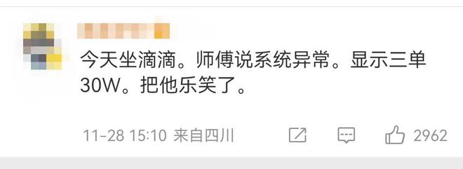 滴滴司机服务页面也出现故障,有司机师傅表示:“系统异常,显示三单30万元。”
