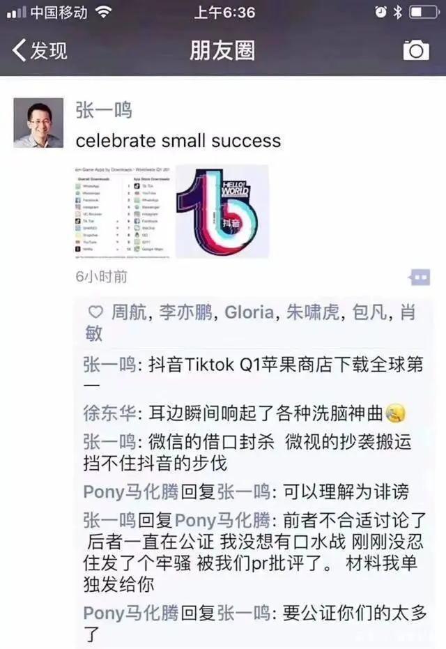 随后便有了张一鸣和马化腾在朋友圈互怼,张一鸣自己评论了一句“微信的借口封杀,微视的抄袭搬运,挡不住抖音的步伐”,马化腾很快回应“可以理解为诽谤”。