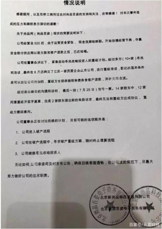 直到最近,《每日新闻时报》记者获得了一份7月底尚品网交给地方工商部门的《情况说明》,才真正证实,原来早在7月下旬,尚品网就已经静悄悄的走上了破产清算之路。