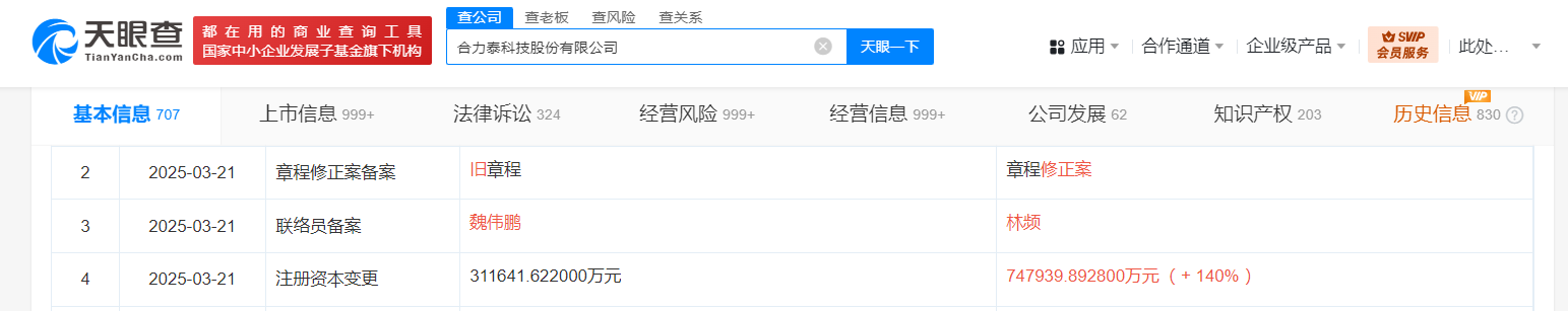 天眼查App显示,近日,合力泰科技股份有限公司发生工商变更,注册资本由约31.16亿人民币增至约74.79亿人民币,增幅140%。