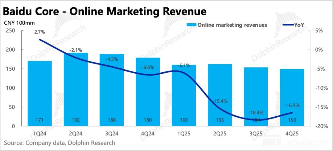 更焦虑的问题出现在搜索广告这个曾经养活百度的现金牛。据海豚投研数据,2025年第四季度百度传统搜索广告同比下滑26%。